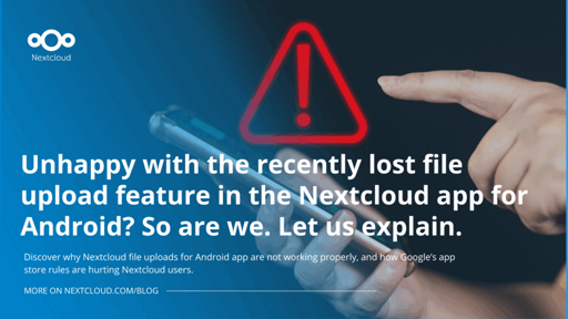 Nemeski@lemm.eeEnglish · 9 months agoUnhappy with the recently lost file upload feature in the Nextcloud app for Android? So are we. Let us explain.plus-squarenextcloud.comexternal-linkmessage-square3linkfedilinkarrow-up111arrow-down10