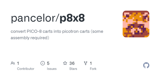 Mac@programming.dev · 2 years agop8x8: convert PICO-8 carts into picotron carts (some assembly required)plus-squaregithub.comexternal-linkmessage-square1linkfedilinkarrow-up16arrow-down10