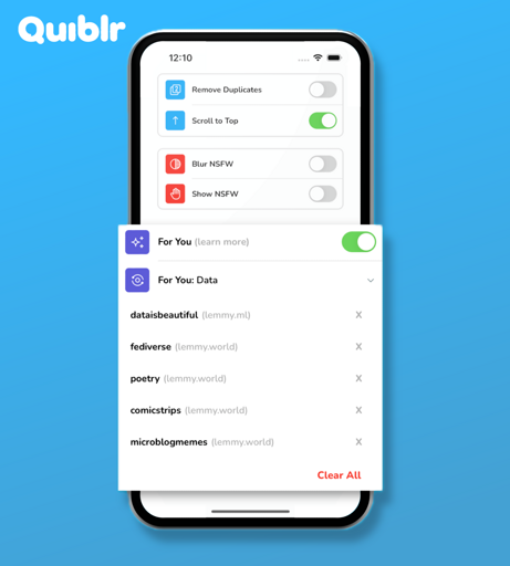 Aurelius@lemmy.worldM · 2 years agoQuiblr now has recommended posts for Lemmy (i.e. For You feed) - 100% private and on-deviceplus-squarelemmy.worldimagemessage-square0linkfedilinkarrow-up12arrow-down10