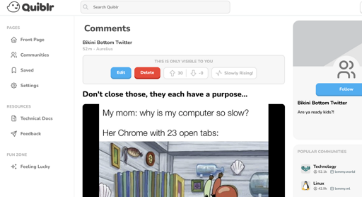 Aurelius@lemmy.worldM · 2 years agoQuiblr: Updates to the For You feed, navigation, and some new features!plus-squaremessage-squaremessage-square0linkfedilinkarrow-up11arrow-down10