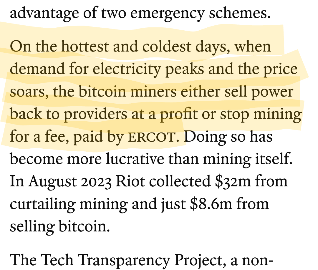 It isn’t all upside for the miners, theoretically, since there’s a risk that power could decrease in cost below their fixed rate contract sometimes. But given how shitty Texas’ electricity grid is and how the state has no ability to actually incentivize building more capacity that probably won’t happen. (actually these miners themselves were envisioned to be this incentive, love to set up a rube goldberg mechanism instead of just being like “build more power capacity”).