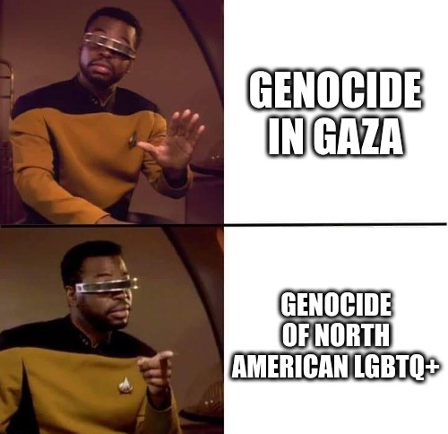 Trump winning supports the genocide of every LGBTQ+ person in all of North America, be it directly or indirectly. No one wants what is happening in Gaza. But, I have to say the potential genocide (in the sense of complete erasure of culture as well as open murders with little to no consequences sense) here is even higher.