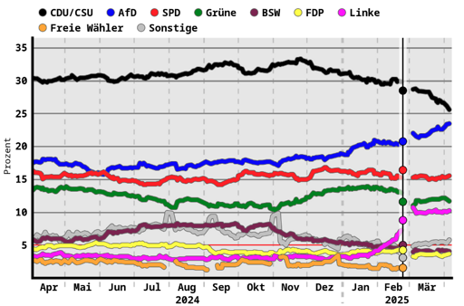 arrow-up11arrow-down1imageFar-right AfD on the way to overtake the conservative CDU in nation wide polls after elections in Februaryfeddit.orgPetersson@feddit.orgM to Germany - Deutschland, but in English@feddit.org · 11 months agomessage-square0linkfedilinkfile-textcross-posted to: deutschland@feddit.org