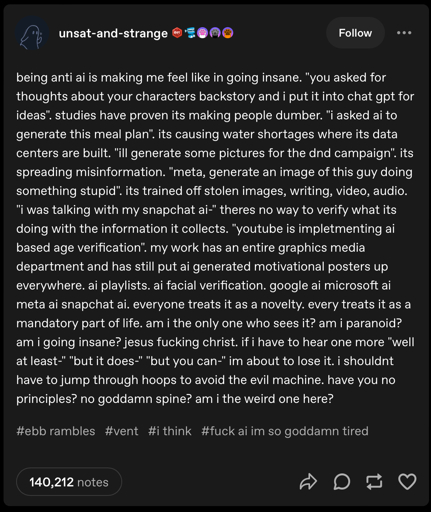 I feel the same way. I was talking with my mom about AI the other day and she was still on the “it’s not good that AI is trained on stolen images, how it’s making people lazy and taking jobs away from ppl” which is good, but I had to explain to her how much one AI prompt costs in energy and resources, how many people just mindlessly make hundreds of prompts a day for largely stupid shit they don’t need and how AI hallucinates, is actively used by bad actors to spread mis- and disinformation and how it is literally being implemented into search engines everywhere so even if you want to avoid it as a normal person, you may still end up participating in AI prompting every single fucking time you search for anything on Google. She was horrified.