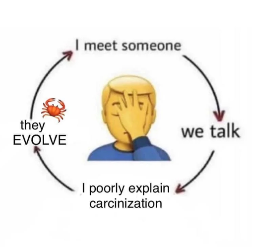 arrow-up181arrow-down1imageThats a poor explanation of carzinization. But it's crabby time nonethelesslemmy.dbzer0.comSnokenKeekaGuard@lemmy.dbzer0.comM to Surreal Memes@lemmy.dbzer0.com · 4 months agomessage-square0linkfedilink cross-posted to: science_memes@mander.xyz