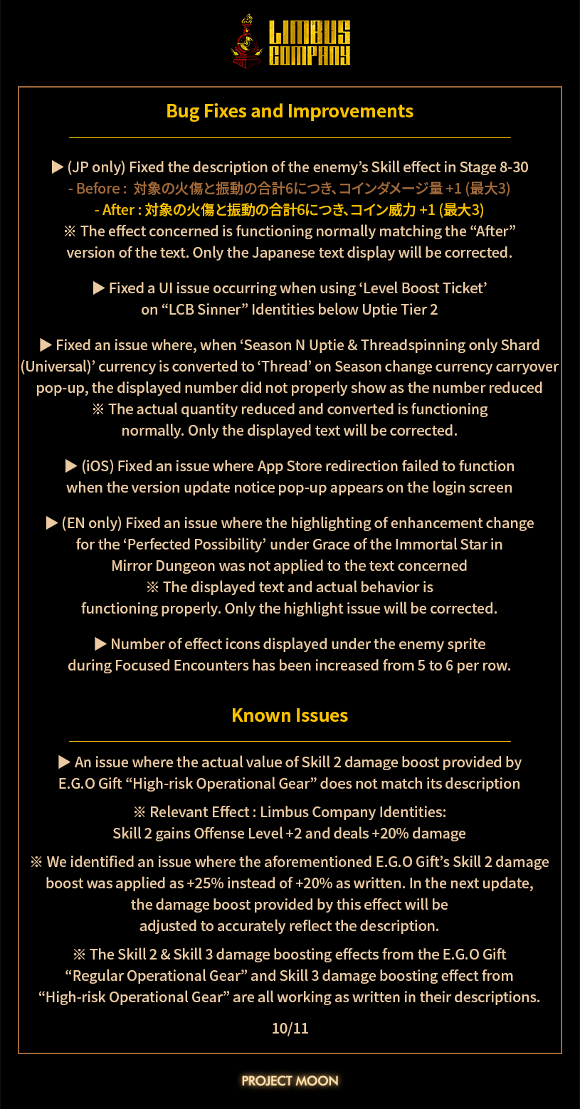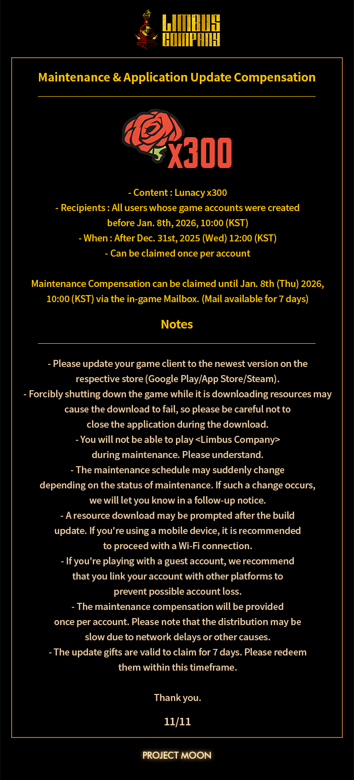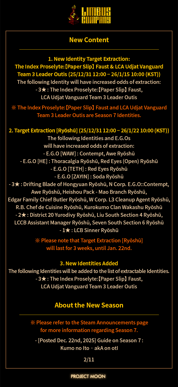 arrow-up13arrow-down1image[Limbus News] 2025, Dec. 31st Scheduled Update Noticeclan.akamai.steamstatic.comLeGaosaure@lemmy.blahaj.zoneM to Project Moon - Welcome to The City@lemmy.cafeEnglish · 4 months agomessage-square0linkfedilinkfile-text