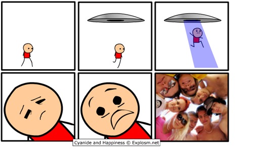 He’s being abducted by a UFO and wakes up inside of it to see random teens instead of aliens, is the joke as far as I can tell. I found the last panel online used elsewhere but it seems to be a common stock photo and not a meme or reference on its own.