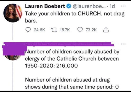 Instead of the fabulous garish fashion and outpouring of love, expression, and inclusion in a cheaply decorated tax paying dive bar that is no threat to anyone you get from a drag show, the Catholic Church is a bland seepage of shame, repression, and exclusion in an expensivly adorned tax exempt cathedral that tends to threaten all manner of earthly punishment whenever it gets a little power.