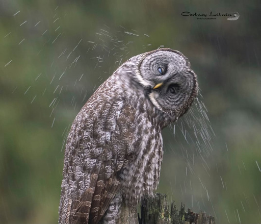 A great gray owl shakes off water after a downpour in Eastern WA. Notice the nictitating membranes protecting its eyes.